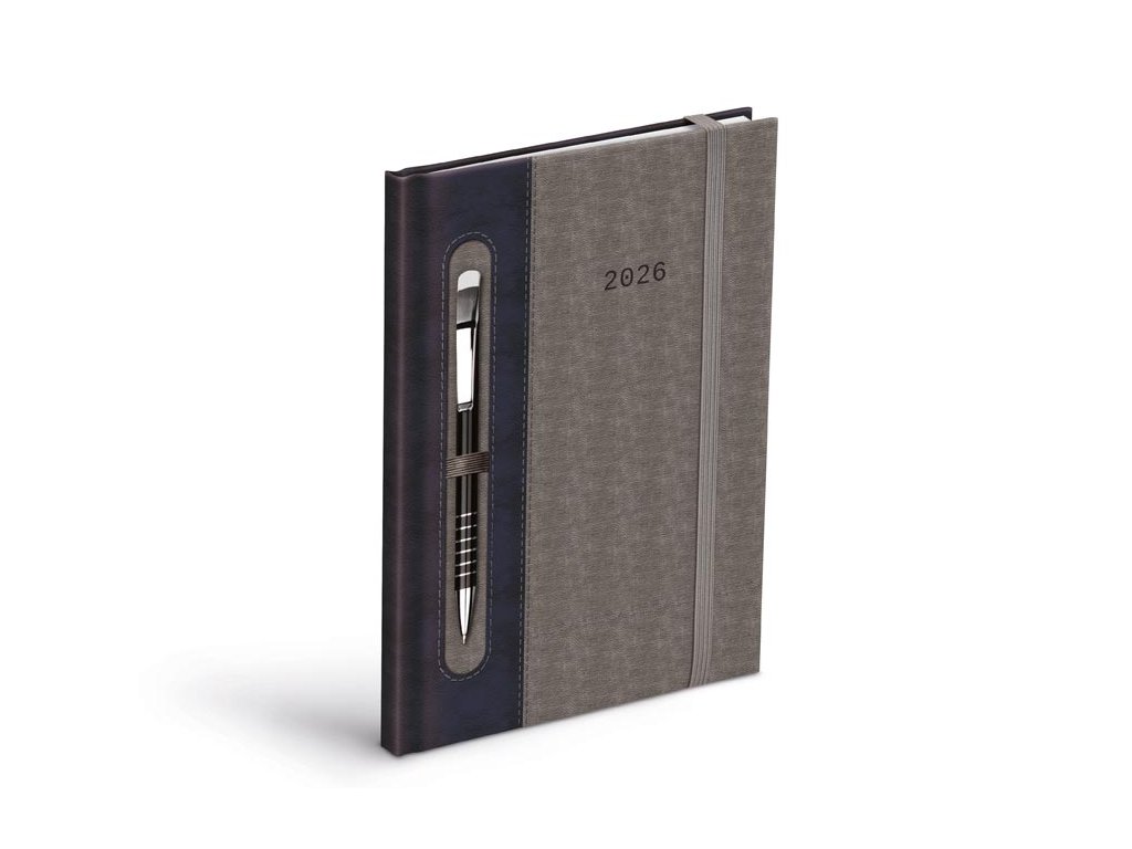 Diár 2026 T805 PU tmavomodrý/sivý s gumou na pero